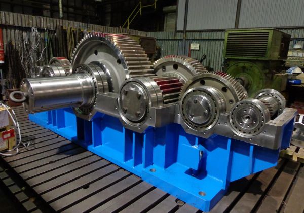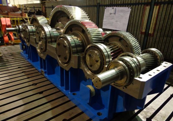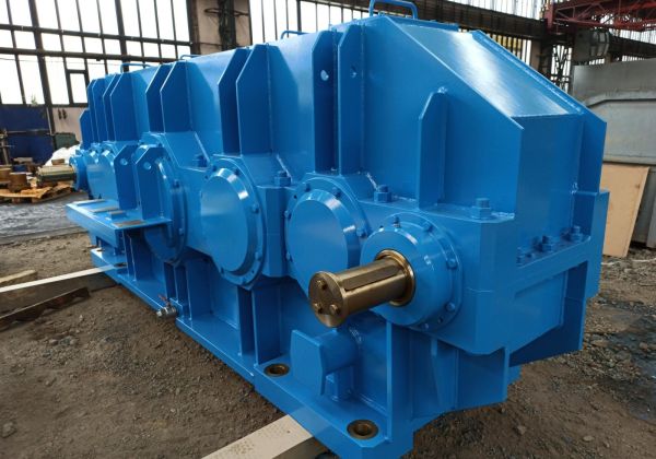 Čelní dvojitá třístupňová převodovka se dvěma vstupy a jedním výstupem.