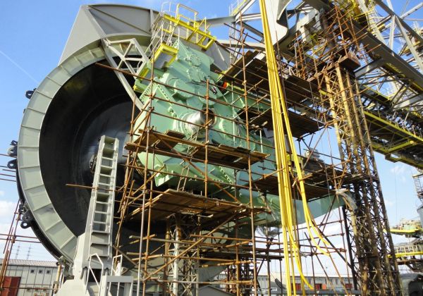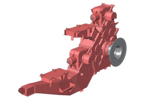 Double four-stage bevel-helical gearbox with two inputs and one output. With a length of about 11 meters and a height of almost 7 meters, it is the largest gearbox ever manufactured in our plant.